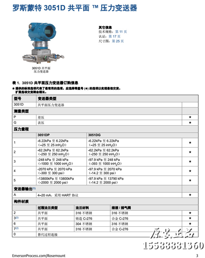 羅斯蒙特3051DG壓力變送器選型列表: