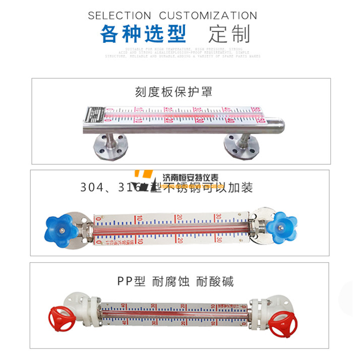 磁翻板液位計儀表可用于各種塔、罐、槽、球型容器和鍋爐等設備的介質液位檢測。磁翻板液位計可以做到高密封,防泄漏和適用于高溫、高壓、耐腐蝕的場合。且全過程測量無盲區,顯示清晰、測量范圍大。磁翻板液位計的零部件材料采用1Cr18Ni9Ti、316L、0Cr18Ni9Ti、1Cr18Ni9Ti襯PTFE(聚四氟乙烯)、PVC、PP等材料,具有優秀的可靠性和抗腐蝕性能。